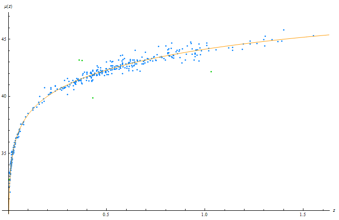 В 2008-2009 годах я как раз интересовался этими данными по сверхновым типа Ia. Эта замечательная троица нынешних нобелевских лауреатов намеряла данные по полусотне сверхновых, а потом другие намерили ещё несколько сотен. На приведённом ниже графике я учёл данные по 398 сверхновым: