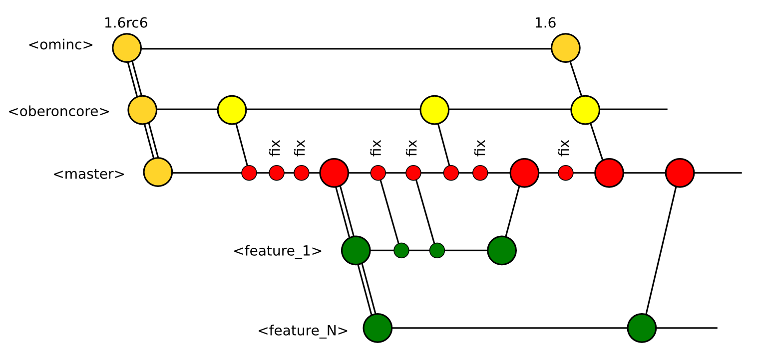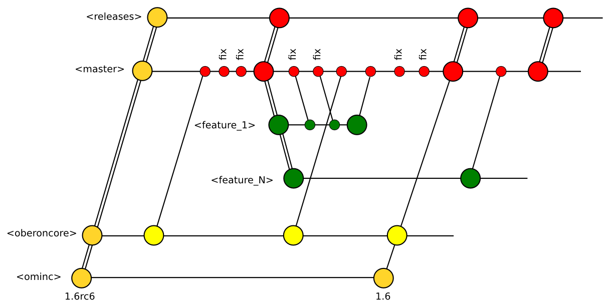 Вот как я вижу... отличия в том, что не вижу смысла делать отдельную ветку для релизов и делать ветки на разработки фич пока не применены все известные заплаты. Любое исправление делает новый выпуск, зачем кто-то будет качать глючные версии или устаревшую документацию. Совместимость может нарушится, если внедряется новая функциональность или правится конвертер. Куда-то на сайт (сокорее всего это будет oberoncore.org) нужно будет выкладывать стабильные версии в архивах, конечно.