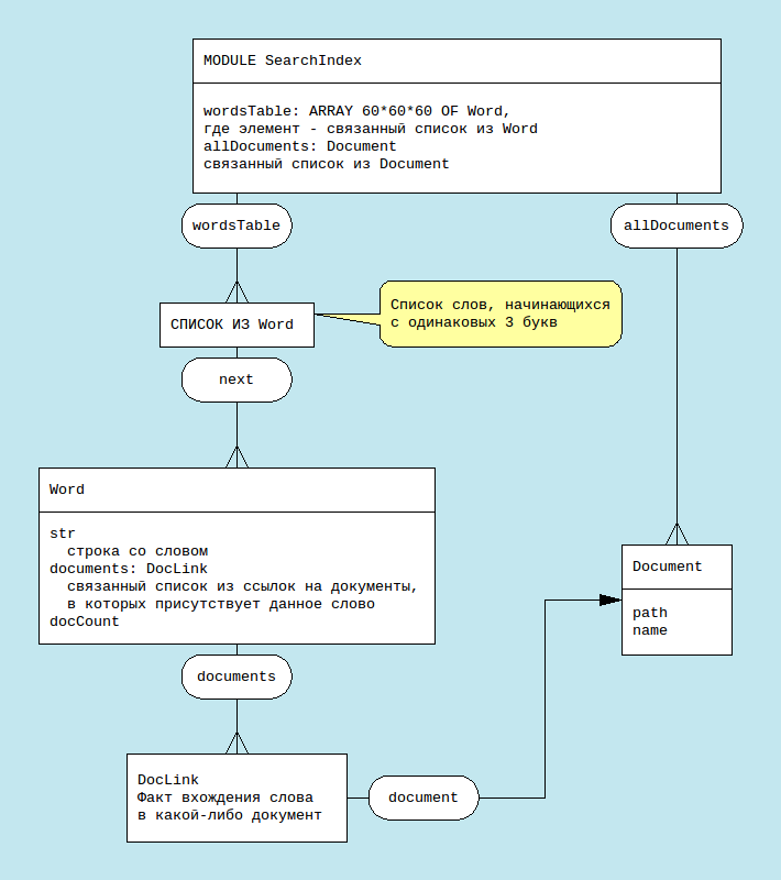 Итак, вверху нашей диаграммы - сущность модуль Index. Какие переменные модуля мы на ней отразим? currentDoc можно не отражать, он не существенен для понимания структуры данных, он имеет чисто служебное значение для процедур.