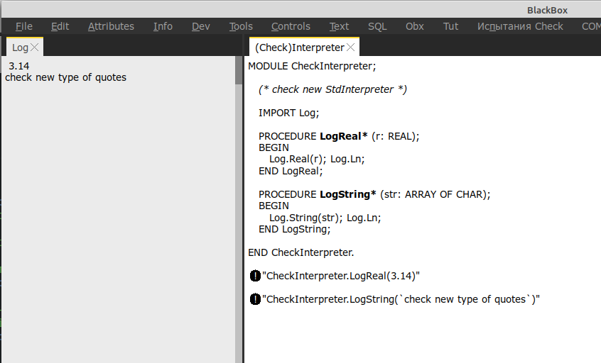 предлагаю забрать у меня StdInterpreter из этого коммита. надо чуть-чуть косметики (убрать UP, ещё мелочи), чтобы вернуть его в компонентный паскаль, и будет полностью совместимый со старым, плюс дополнительные радости: