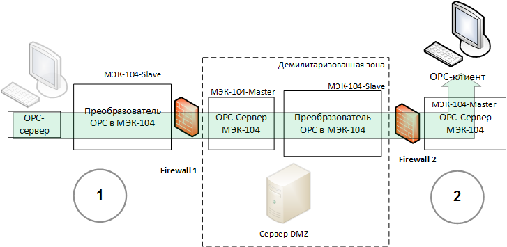 Сети 1 и 2 не соединены между собой, только через ДМЗ, причем осуществляется фильтрация сетевых сообщений передачей данных АСУТП. Чтобы исключить, скажем, ARP-атаки по сети или непредусмотренное конфигурирование или обновление ПО.