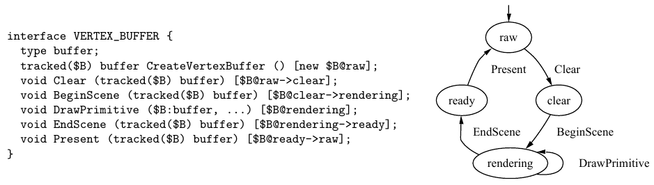 https://www.microsoft.com/en-us/researc ... pldi01.pdfВ данном случае подразумевается поддержка "протокола ресурсов" -- отслеживание порядка операций над объектом (а также "время жизни" -- регионы памяти), представляя последний как виртуальный автомат -- см. рисунок: