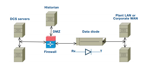 Здесь для взлома нужно миновать справа налево диод, затем firewall. Если диод реализован честно, то он все-таки однонаправленный. Принципиально одно, по сети вывести из строя DCS нельзя, только по месту, болгаркой.