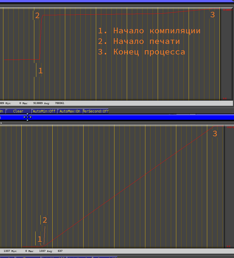 Как только я отправил Сергею эту картинку, я решил снабдить её и фрагментом кода. Но, почитав код ,я уведил, что я более тысячи раз выделяю объект размером в 1 мегабайт, который служит для вывода буквально нескольких знаков на печать, после чего уничтожается.