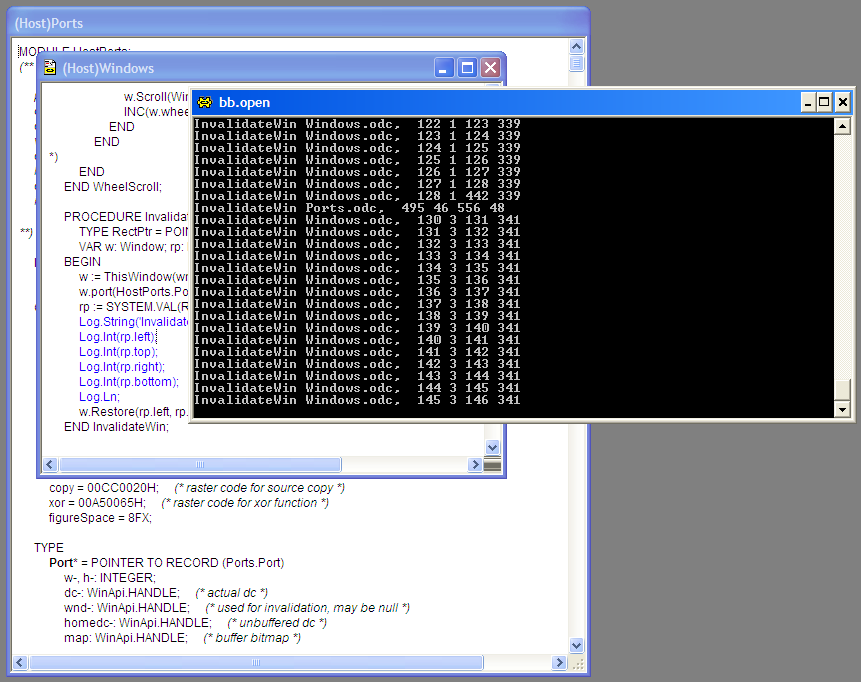При каждом движении окна "bb.open", вызывается InvalidateWin для нижележащих окон "(Host)Ports" и "(Host)Windows". В логе, кстати, заметно небольшое приращение координат области перерисовки для окна "(Host)Windows" - это я аккуратно двигал окно консоли слева направо по горизонтали.