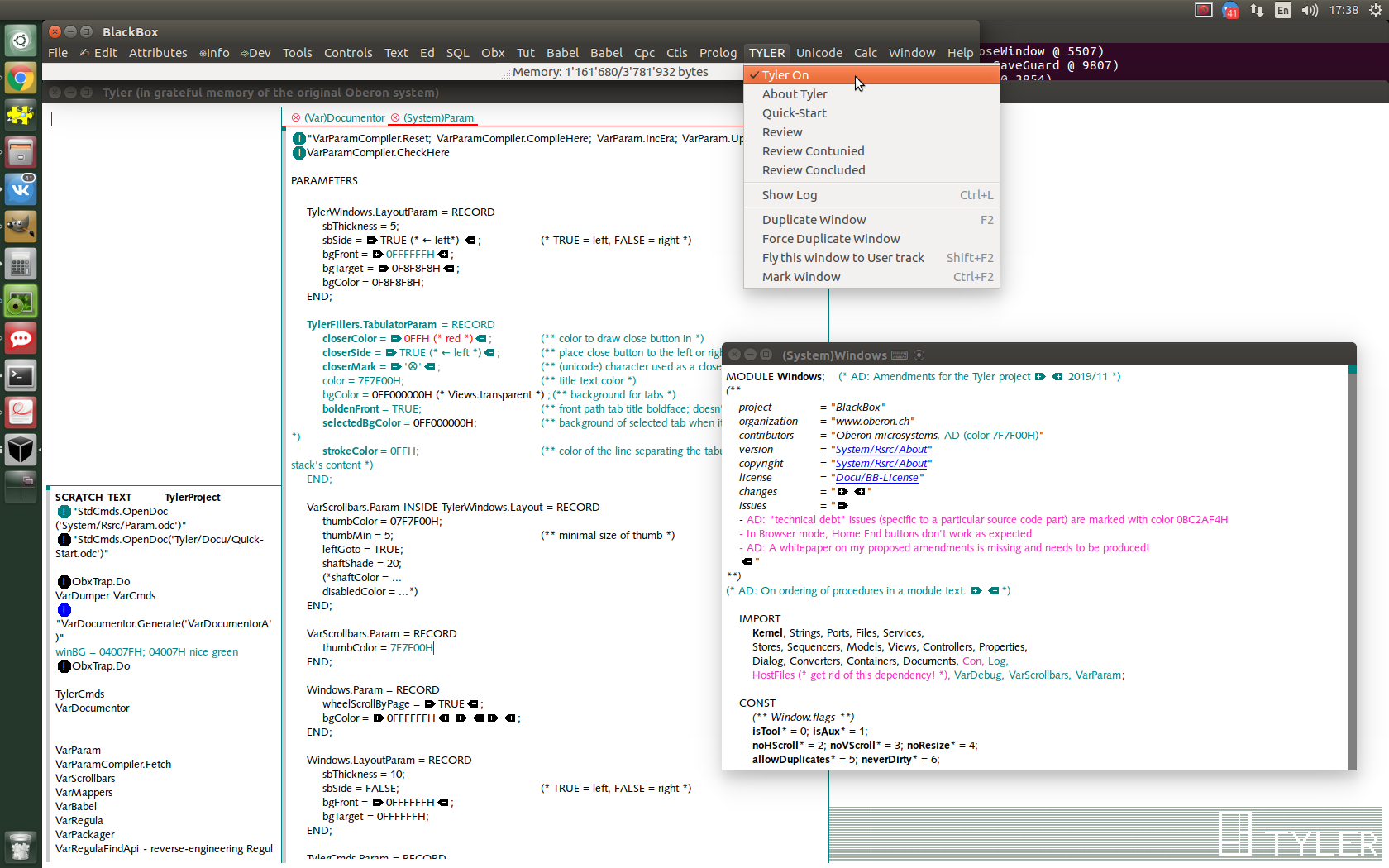 Проект Tyler - это одноименная подсистема (Tyler) + ряд изменений в стандартных модулях BB, которые оказались необходимы или желательны в связи с существенной перетряской оконной системы. Больше всего изменились интерфейсы Windows и HostWindows, расширена реализация и интерфейс Views, кое-что подправлено в Kernel; ряд модулей потребовали незначительных поправок в связи с изменением интерфейса Windows.