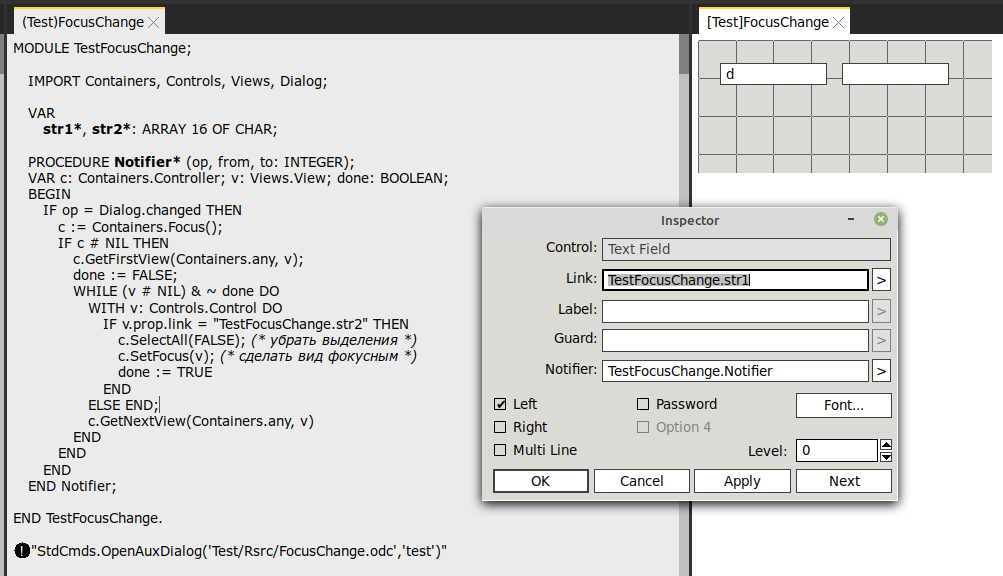 Получился пример, который работает, когда форма открыта как внутренний (Aux) диалог. Запускается уведомитель, получает контроллер контейнеров, проходит по видам контейнера в поисках нужного поля и его выделяет. Код: MODULE TestFocusChange;