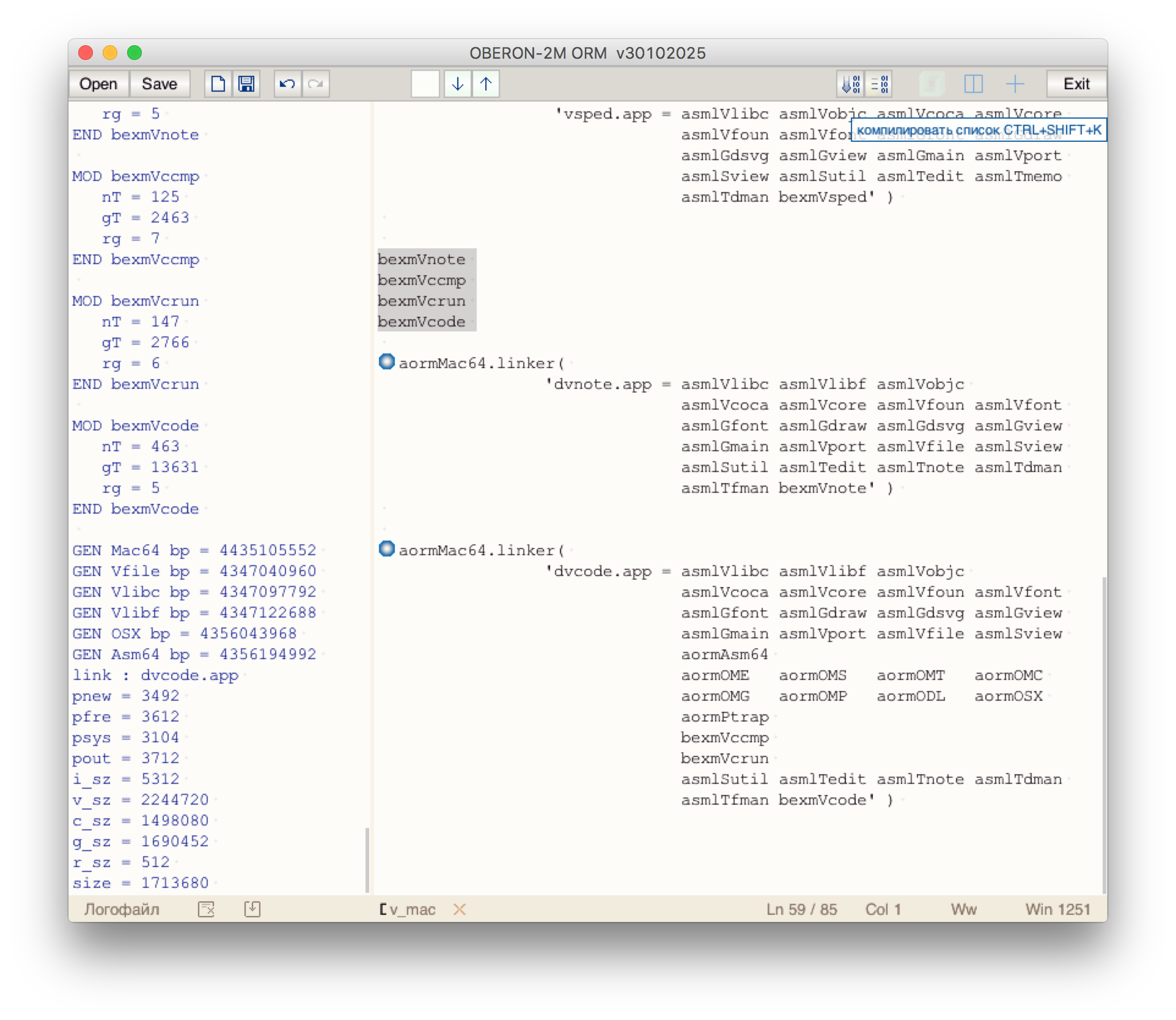 Ormcode - кросс компилятор языка программирования Oberon-2M ORM для Mac OS. Компилирует и собирает сам себя. На Mac OS под Windows. На Windows под Mac OS. Наоборот тоже работает. Если, есть необходимость положу архив здесь же.