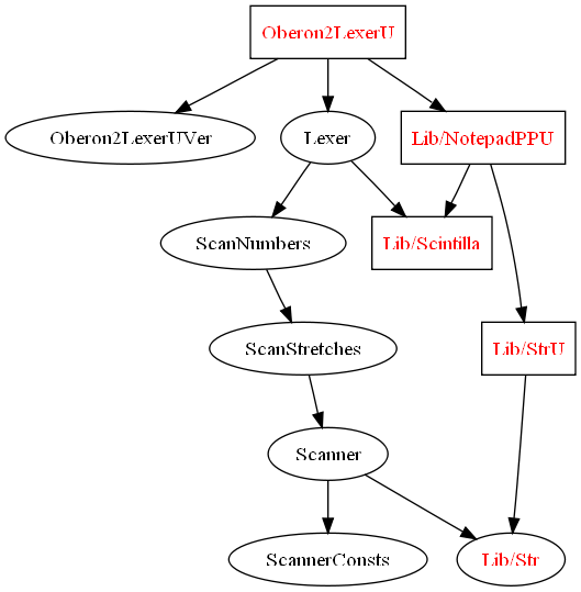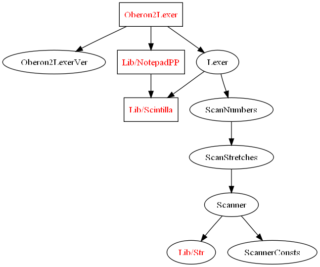 Полные исходники плагина прилагаются (два проекта на XDS Oberon-2, тот, что с суффиксом "U" - для Unicode-версии Notepad++). Синтаксический разбор сделан максимально ниотчегонезависимо (см. структуру проекта на приложенных картинках). Отдельный модуль связывает плагин с Notepad++, отдельный модуль связывает его с Scintilla, а сканер работает вообще сам по себе и может быть портирован в любое приложение. На картинке красным отмечены модули, импортирующие SYSTEM, в прямоугольную рамку взяты модули, импортирующие "окна" (модуль Windows), овалом - все остальные.