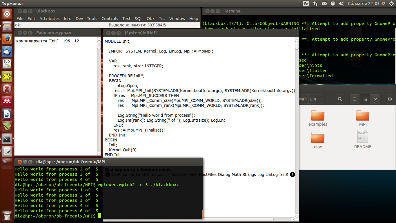 С помощью oo2c на Ubuntu получил H20, получил последние привязки к библиотеке для распределенных вычислений mpich.so, подправил их немного, написал на Linux-версии Блэкбокса простую программу.