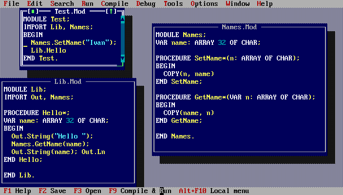 Теперь можно с лёгкостью компилировать программы, состоящие из нескольких модулей. Среда сама строит дерево зависимостей модулей, определяет, какие из них «системные», а какие пользовательские, подключает при необходимости графическую библиотеку. Пользователю достаточно открыть окно с главным модулем (сфокусировать на нём) и нажать F9. Модули компилируются по отдельности, в правильном порядке, после чего происходит компоновка исполнимого файла. При желании, все этапы этого процесса можно настроить с помощью скриптовых файлов, которые и запускает среда: