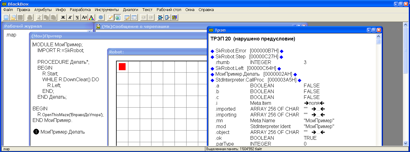 Похоже идея использовать один модуль для интерпретатора и для КП оказалась неудачной. Если бы был отдельный модуль робота для КП, в каждую команду можно было бы вставить предусловие и трап был бы всего в одном шаге от нужного места.