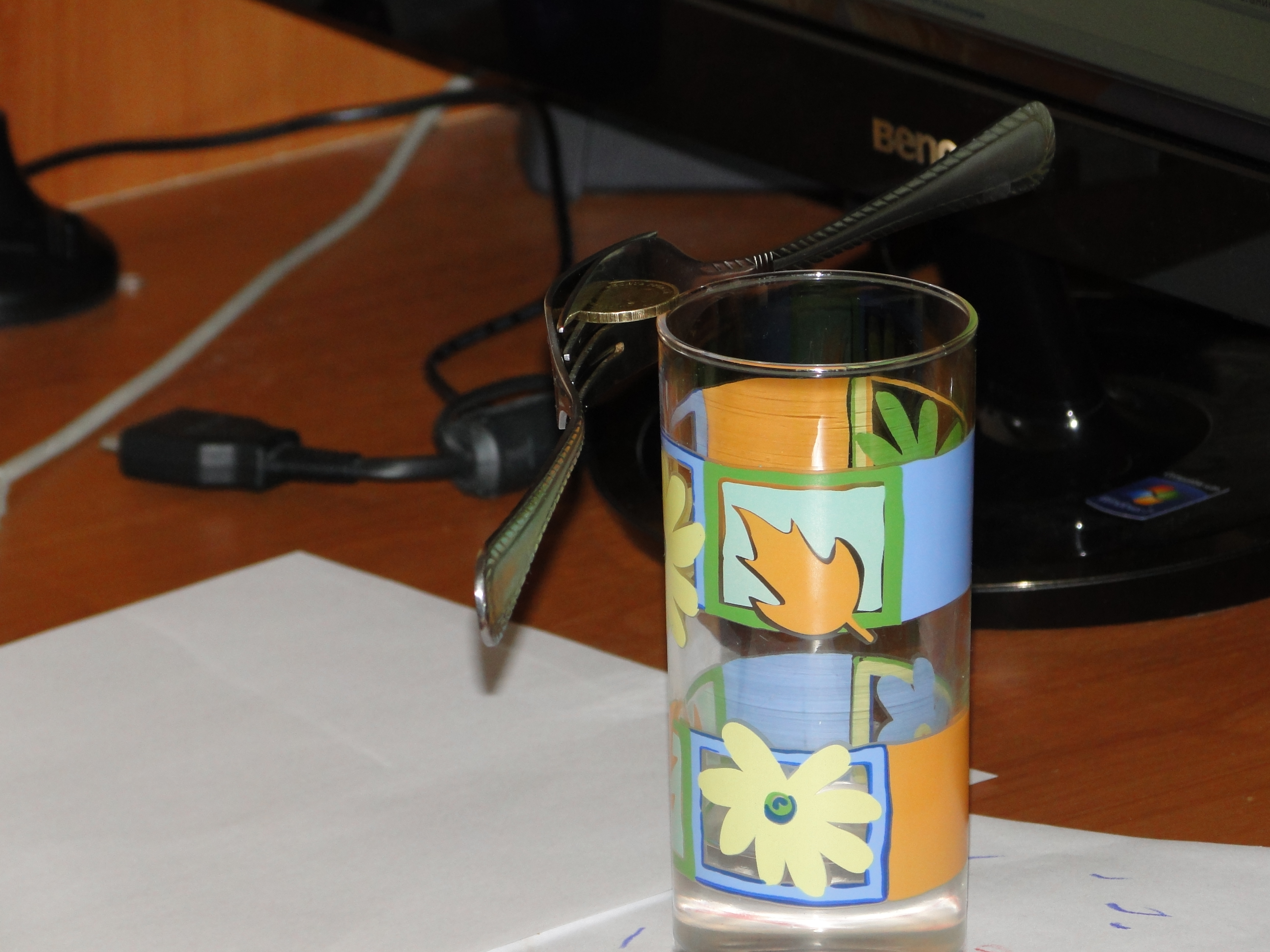 Фокус хорош... он весь в том, помнится, как расположить вилки относительно пятака... так, чтобы ЦТ полученной конструкции смещался в сторону стакана :)