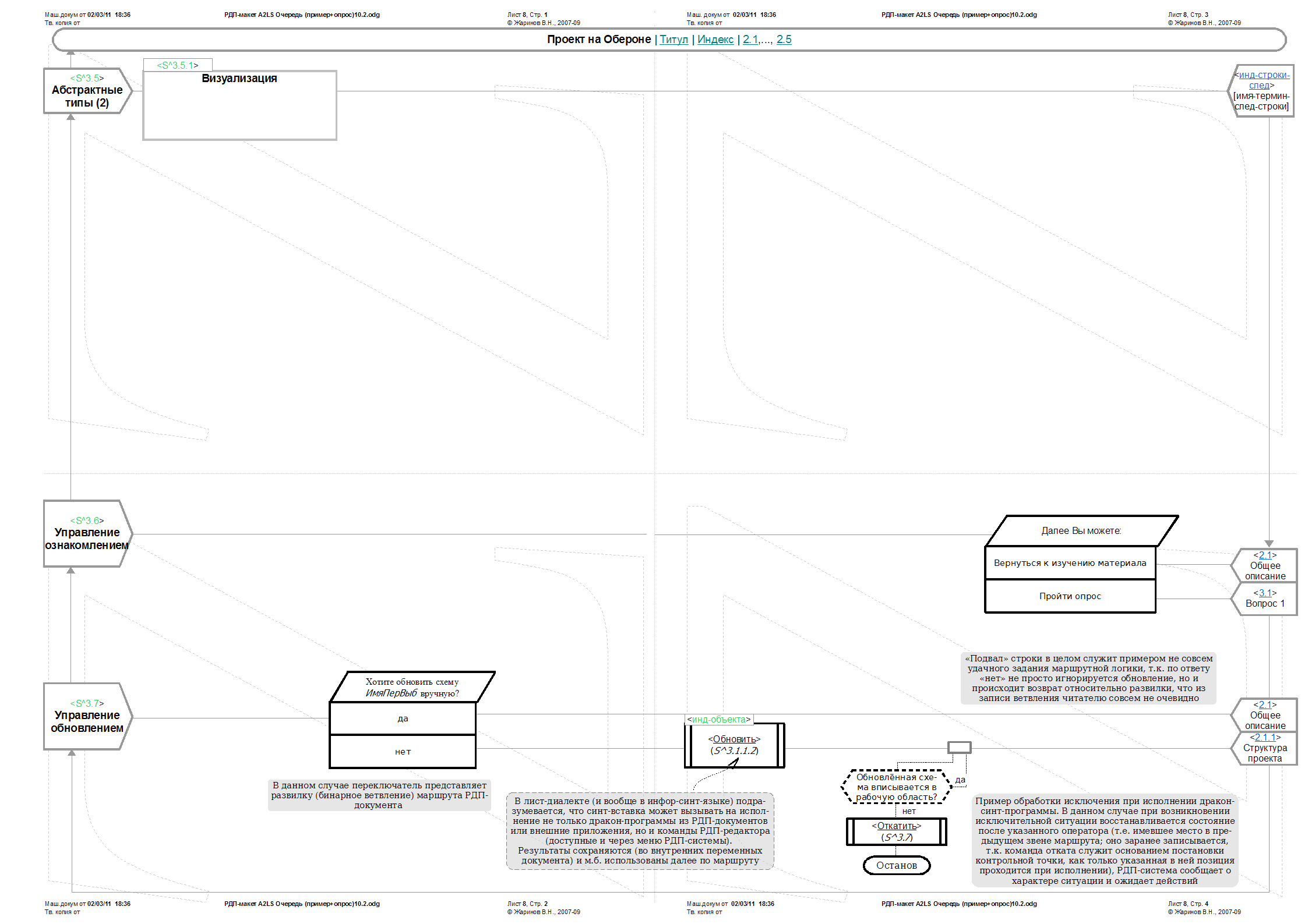 Сочинитель предусмотрел в строке 3.7 инициируемое пользователем обновление некоей ДМ-схемы (её можно найти на этом рисунке) - скажем, чтобы отразить изменения состава процедур с момента последнего обновления, что не суть важно. Важно, что схема должна умещаться в формат, заданный для содержащего её жёсткого поля (возможно, он превышает размер контура поля - который в этом случае становится "окном прокрутки" по формату - но всё же формат конечен, а схема по правилам ДМ-языка неделима). Посему сочинитель предусмотрел при обновлении схемы также обработку ситуации, когда схема вышла за границы формата - очевидно, смысл обработки можно понять из схемы.