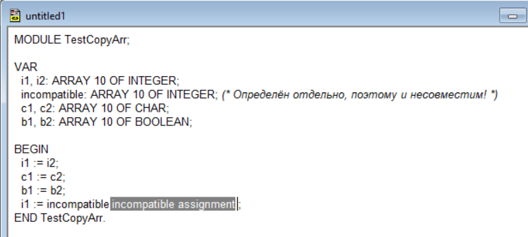 И ещё один вопрос. А в Обероне-2 в принципе запрещено присваивание переменных типа массива или только не реализовано (что в oo2c, что в офронто-подобных)?