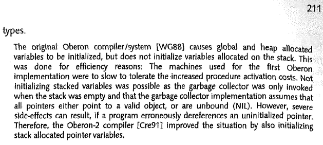 В Обероне этого не может быть, так как нарушает герметичность. Сборщик мусора обрушил бы всю систему на первом же указателе, который случайно забыли проинициализировать. Наверное это тянется с Паскалевской и Модуловской версии книг.