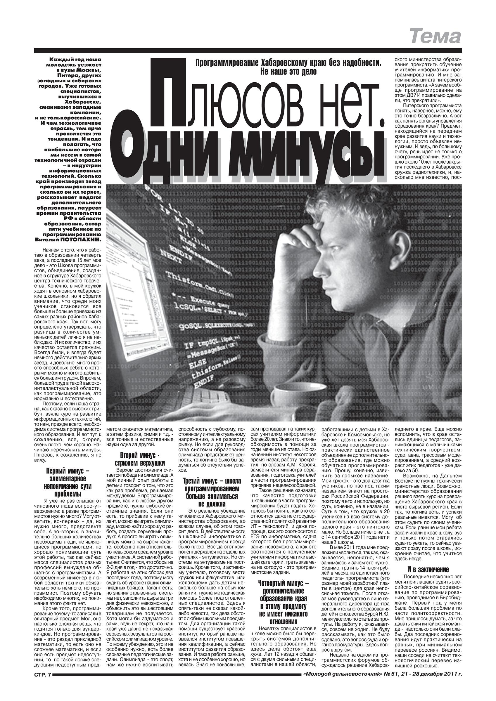 Думаю, что после нового года мне удастся возобновить занятия школы программистов. Но это только первый шаг конечно. Сейчас речь идет не о моей личной обиде, а в целом о отношении системы образования края к нашему предмету. Поэтому будем воевать дальше.