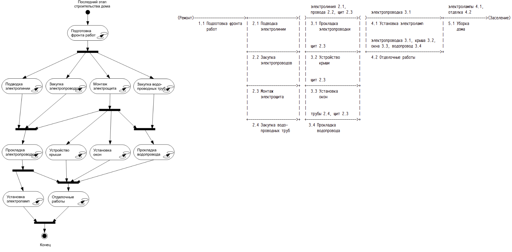 (Р-схема оформлена "не ахти", спишем на кривой редактор, других нет). Здесь как раз используется один тип "перекрёстка" - "от одного до всех". Фактически, это последовательность работ, которую можно задать в виде сетевого графика, или на основе полученной схемы ввести в "кубик" план работ с необходимой привязкой к ПМ, и тогда уже получить сеть работ. Но, классический график работ, где м.б. отражены временные показатели, смены, кол-во рабочих и т.п., как-то не удобен для непосредственной разработки процессов, т.е., фактически, это результат проектной деятельности, а также основа для планово-экономической. Как разработчику, или построителю процесса, м.б. важны некоторые алгоподробности, или уточнения, даже на самых верхних уровнях. Например, может возникнуть потребность указать условие выполнения работы не только как "закуплены провода", но и именно белого цвета или жёлтого, если хозяйка дома не возражает. Причём "закупку проводов" можно немного раскрыть, скажем, в цикле покупать пока не достигнем цели. При чём это м.б. важные моменты, которые могут повлиять на разработку смежных процессов, и если их "спрятать" по глубже, то их могут не заметить другие технологи, которые проектируют что-то рядом. К примеру, закупка проводов иного цвета от белого требует согласования с хозяйкой (хозяину всё-равно, тем более провода прячутся в стенах/потолке :) ), а это уже сигнал для разработки процессов для связи с заказчиками, где особенно важно учесть возможность работ в ночной смене...