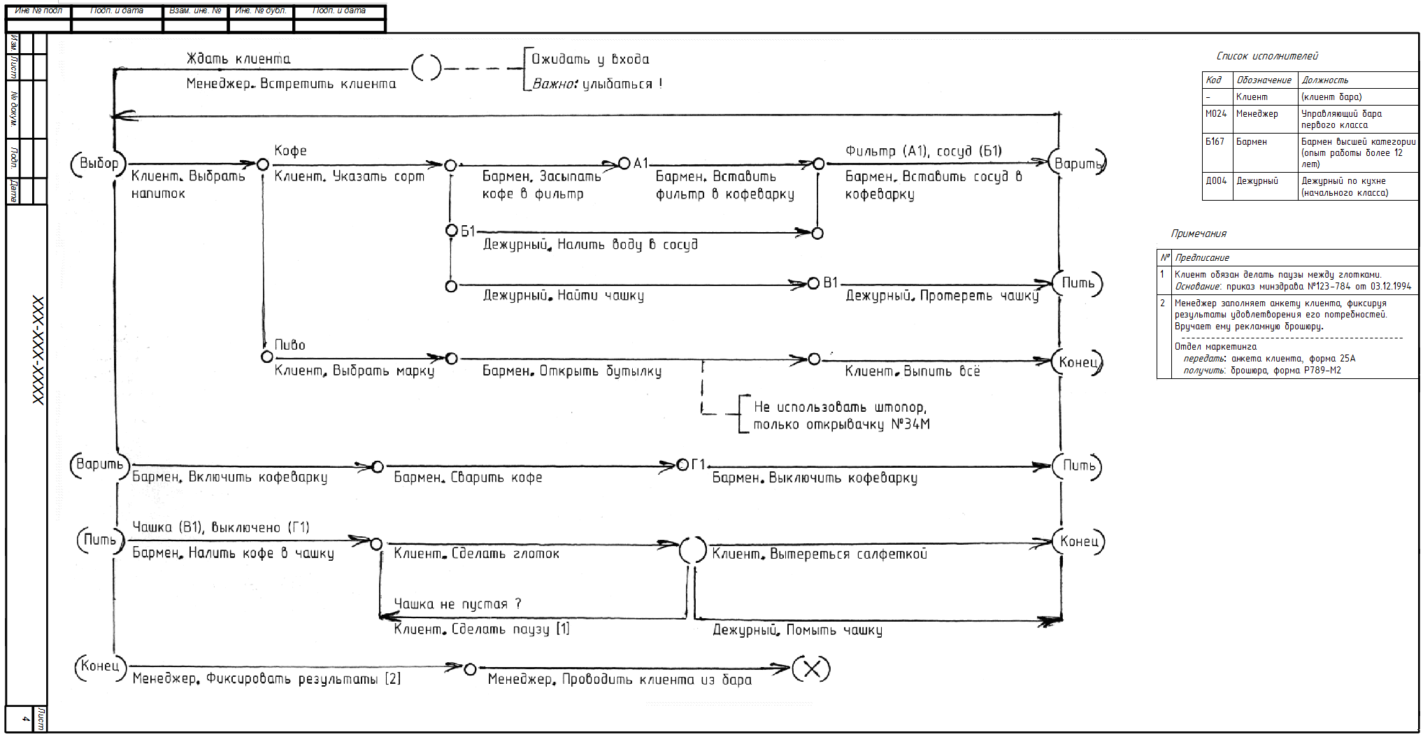 Здесь есть попытка реализовать драконовский силуэт, короче говоря, на "кривости" не смотрим. Можно сказать, что это некий снимок протекающих процессов, что м.б. результатом описания уже происходящего или планируемого. Причём алгоритмика представлена "в целом", т.е. что происходит, когда клиента занесло в бар. Для разборов полётов можно составить алгосхему, скажем, для бармена, где расписать именно его действия для обслуживания клиента. Или в отдельной схеме представить некую "координацию" всех действий бармена, скажем, пока нет клиента нужно протирать стаканы, если их уже помыл дежурный по кухне, или заниматься заготовками для коктейлей и т.д. И такой комплект схем даст основу для связанных расчётов, к примеру, можно оценить "пропускную способность" бара, сколько нужно стаканов, открывашек и т.п.